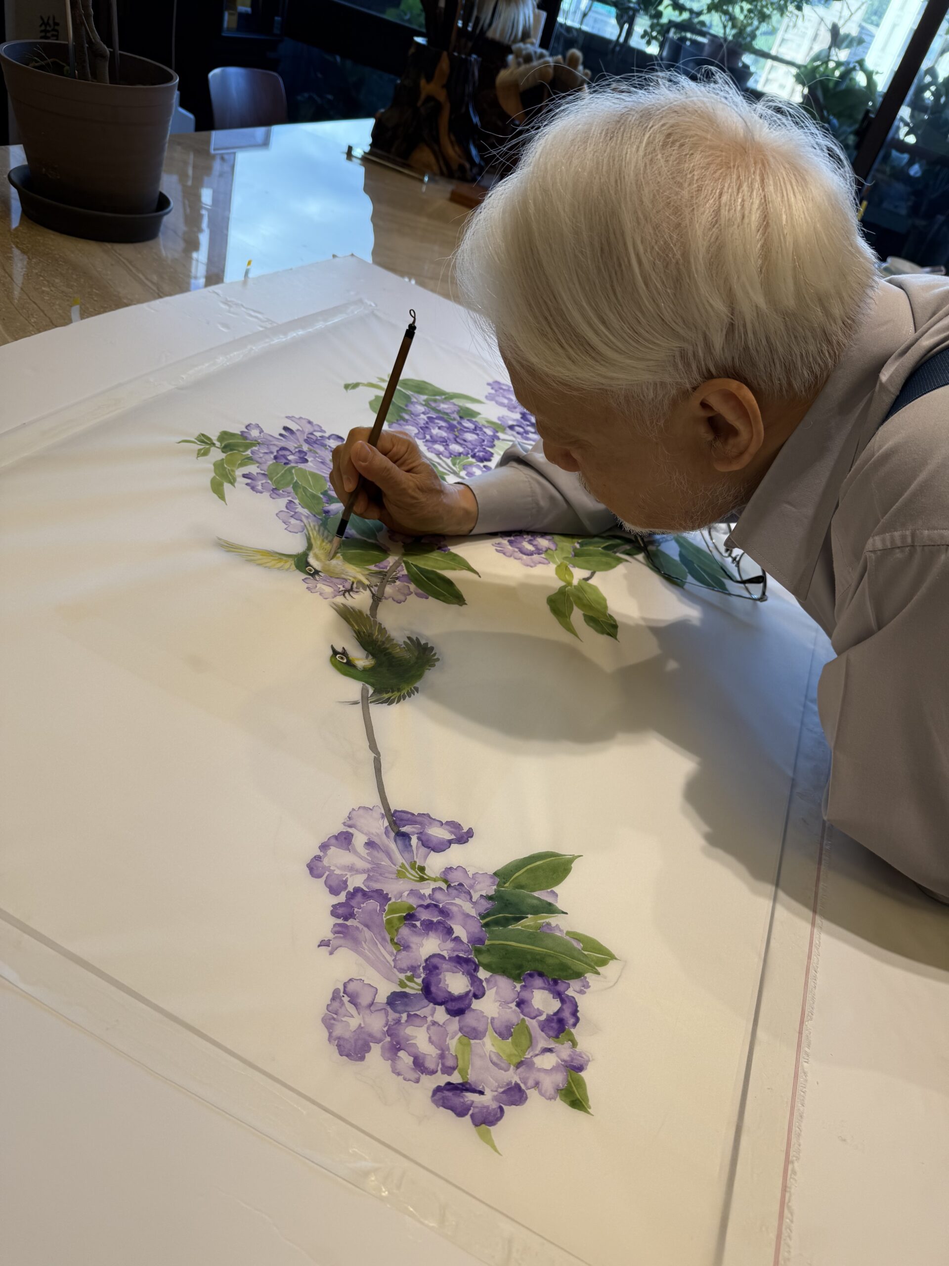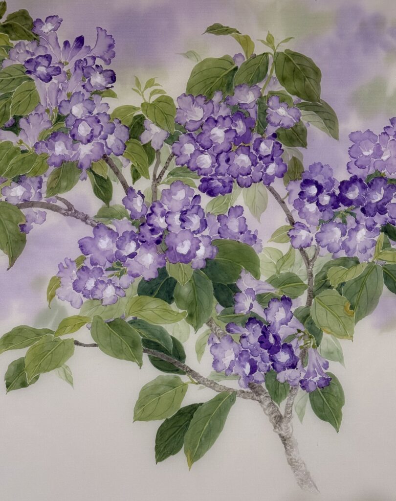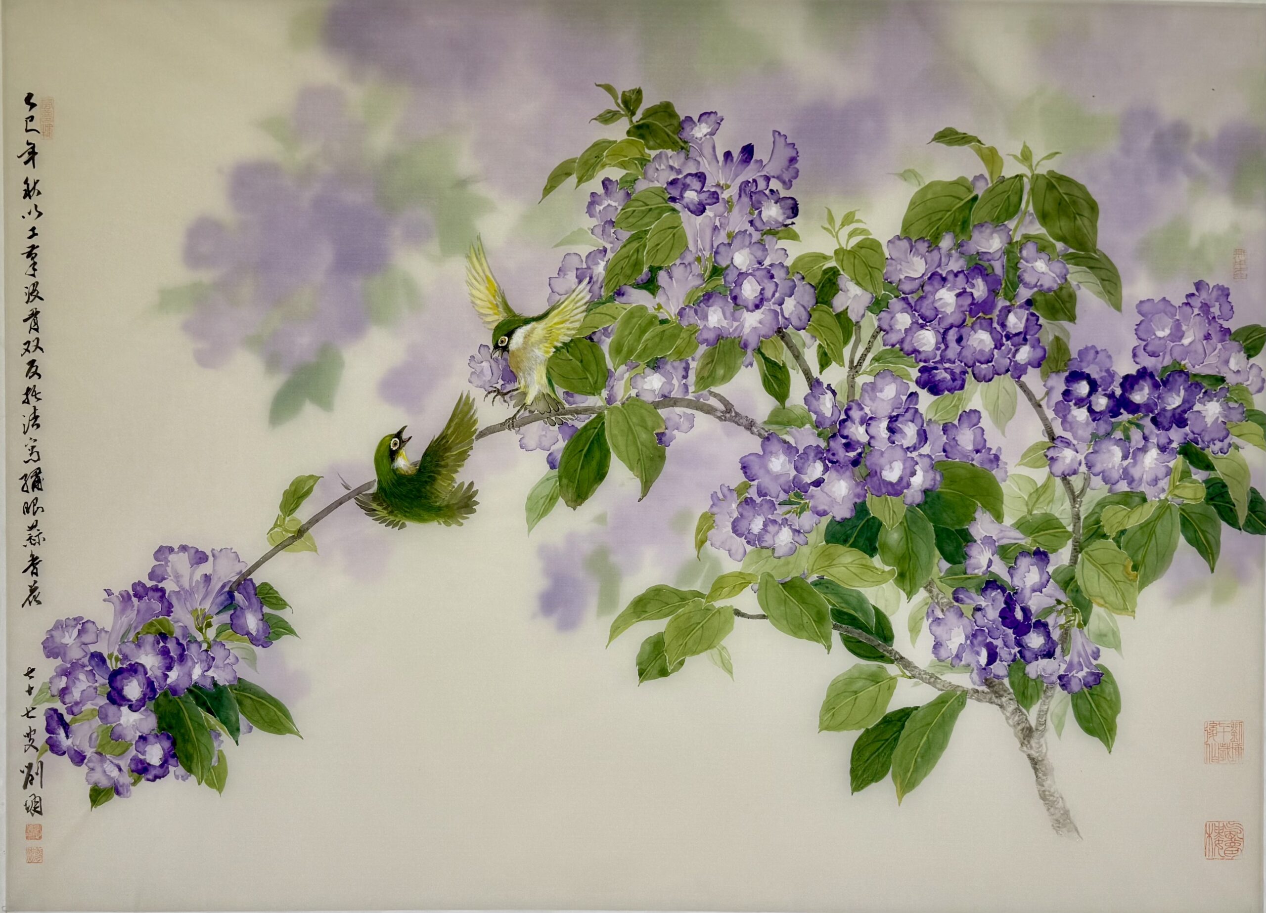 又到了「蒜香花」開的季節,我陽台上有一棵,雖然長得不大,也開了幾串花,於是把自己鎖在家裡一個多禮拜,完成了這張《繡眼蒜香花》。