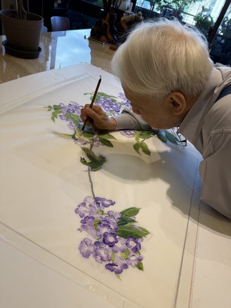 蒜香花的美是它色彩的漸層變化,深深淺淺簇擁成繡球的樣子。它的枝子不是黑褐色,而是淺灰的,所以我用乾筆枯墨表現。七十七歲的劉老頭還在用沒骨、撞粉、反托的方法,畫密密的小花,實在有點不自量力,也算是不服老的自我挑戰吧!希望大家喜歡!