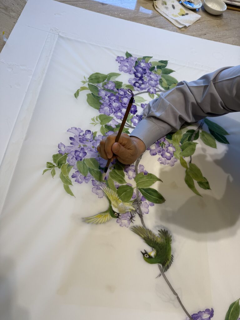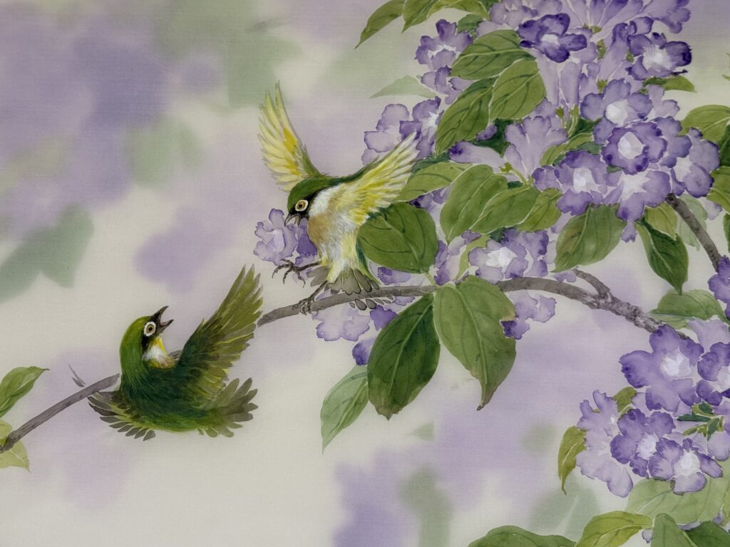 兩隻繡眼小鳥是挑戰,因為牠們的顏色跟蒜香花的葉子很像,可我又覺得小小的繡眼跟蒜香花很配。藤蔓的花朵就應該配頑皮的小鳥!