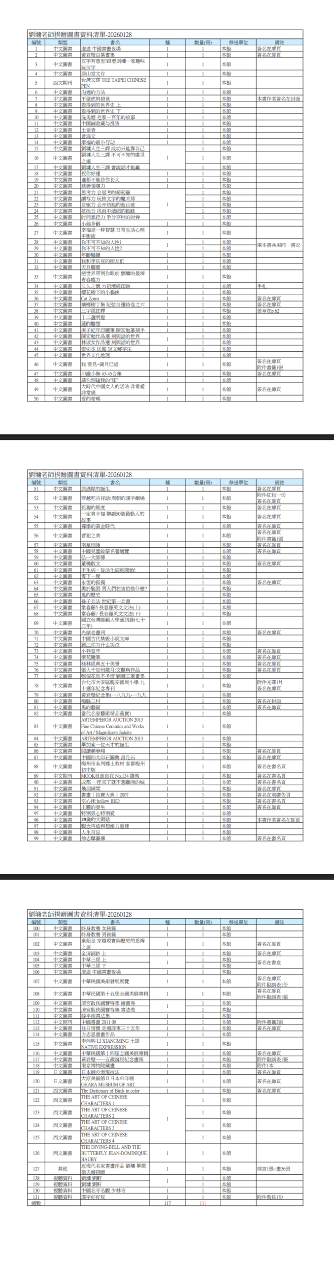 劉墉先生捐贈藏書給國家圖書館。第一批共113件: