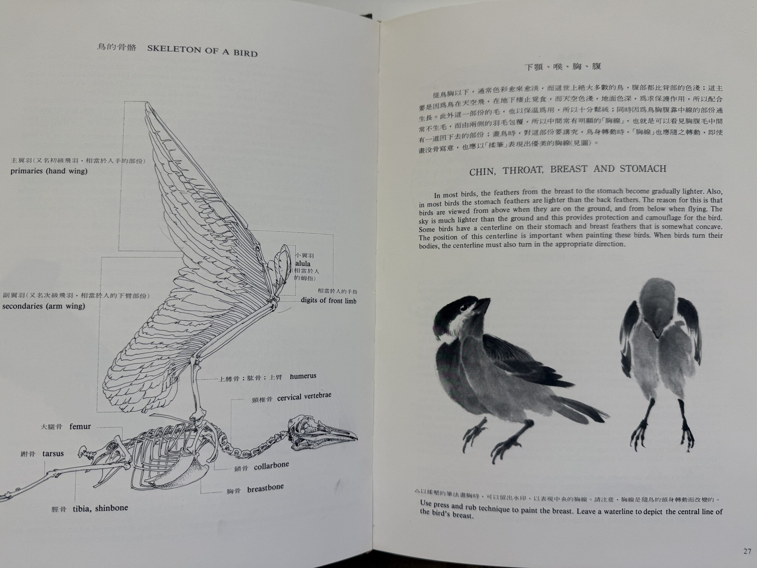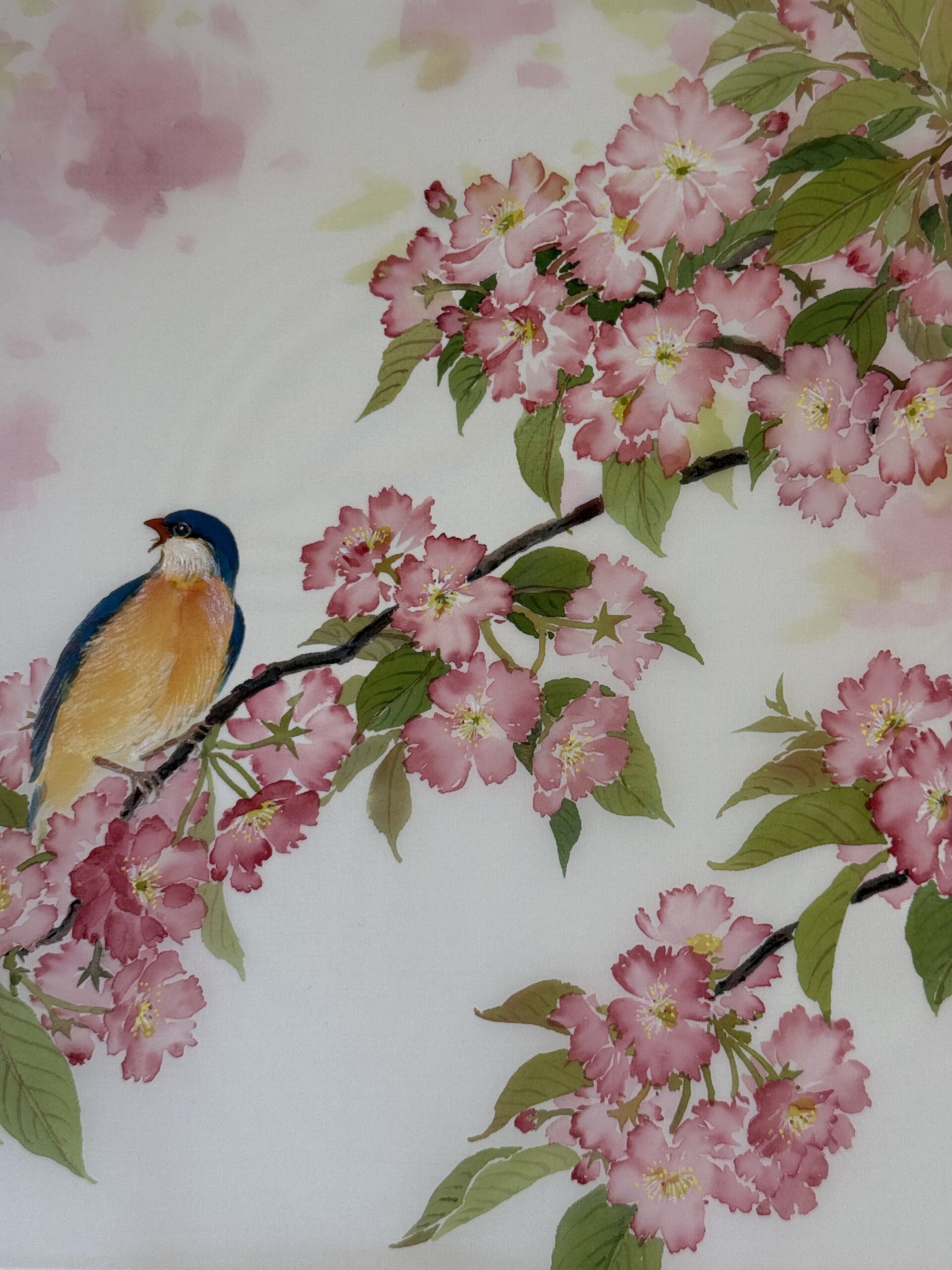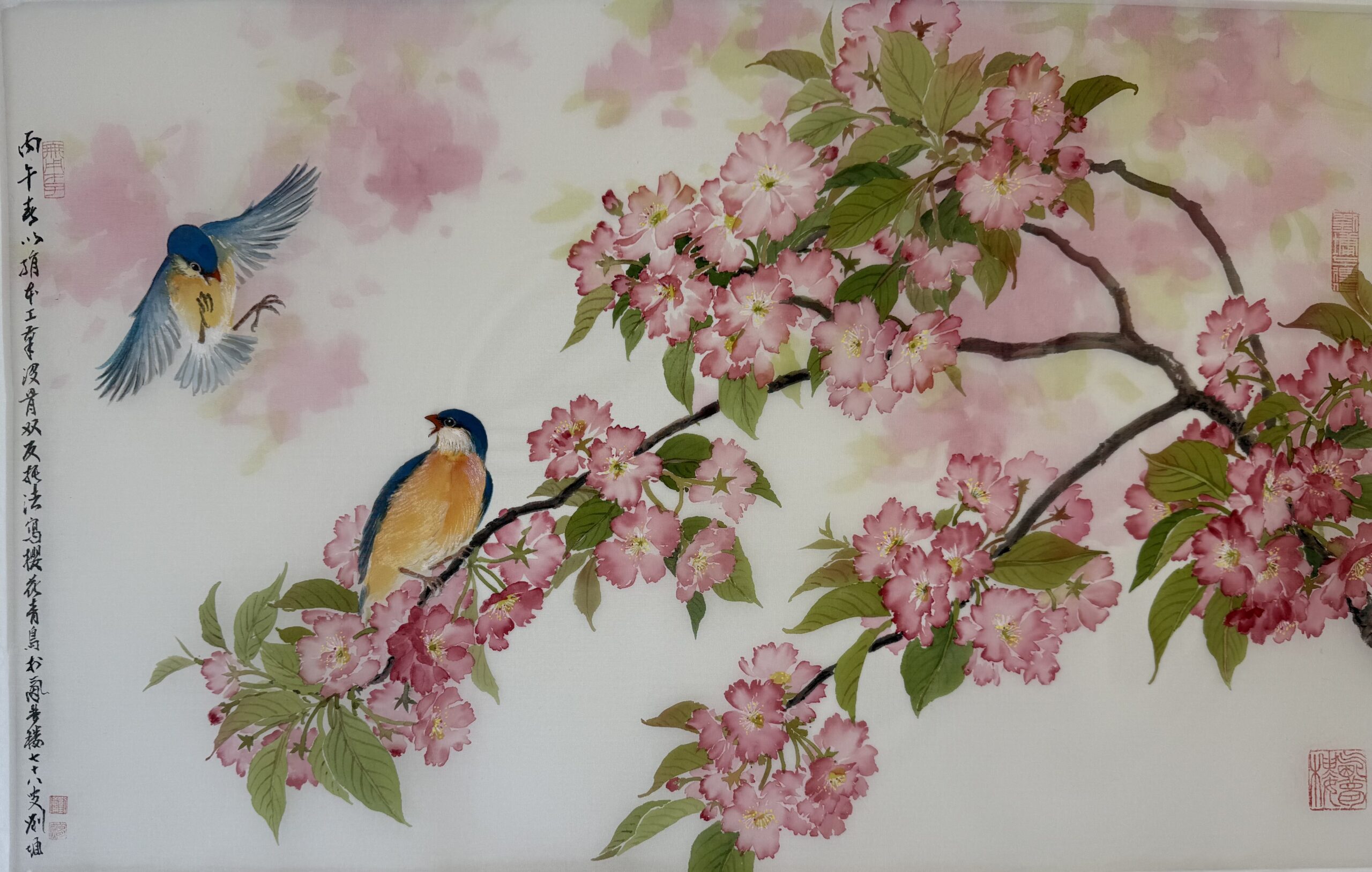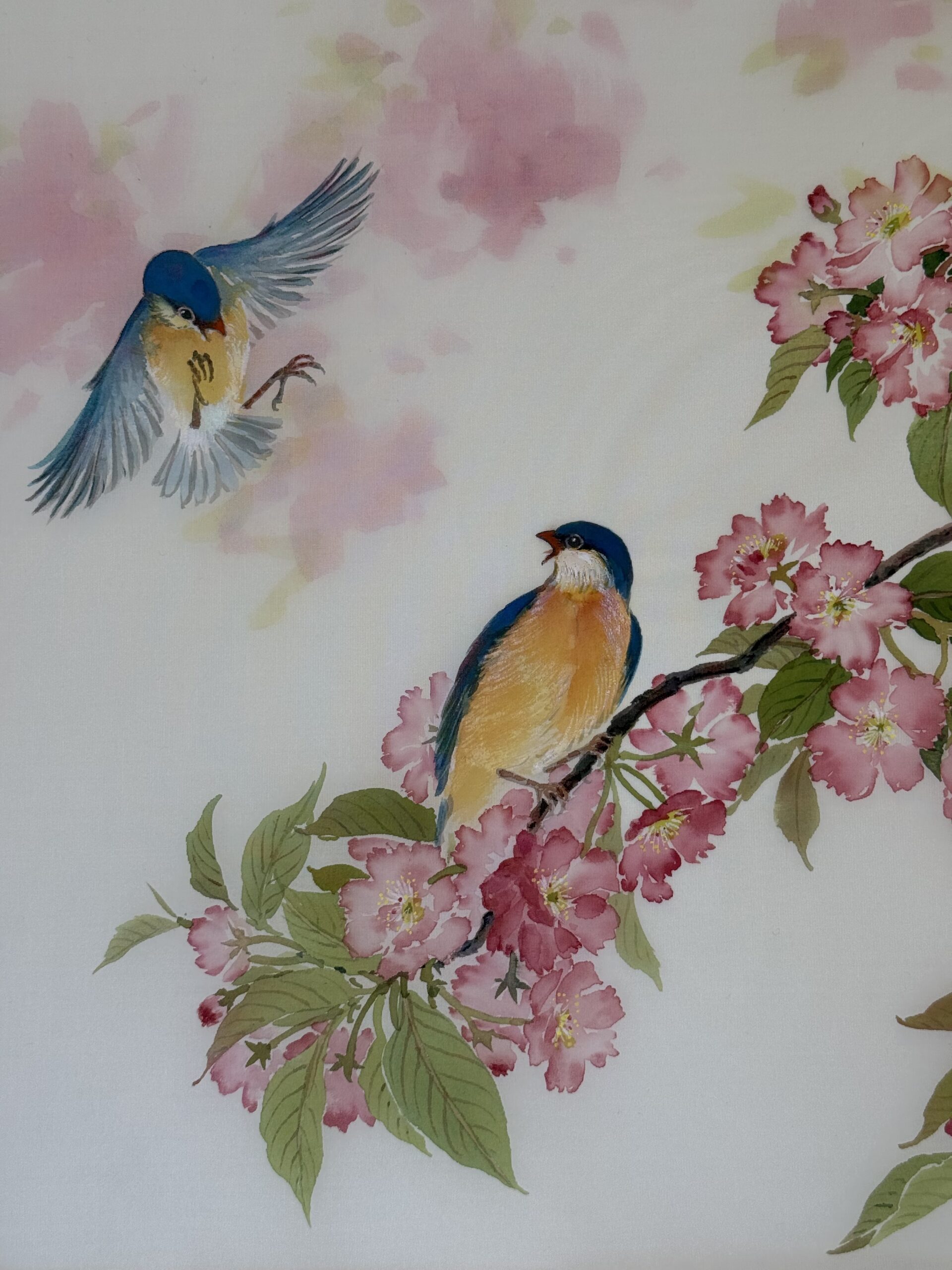 我用了迴環的構圖法,讓許多枝子從右向左伸展,又逐漸合攏。就在那合攏的地方畫一隻「仰首盼情人」的青鳥。我畫的小鳥都人格化,飛來的那隻為了減速,尾巴張開,用力向前拍翅膀,所以翅膀尖端都微微翹起。兩隻鳥的爪子不平行,讓高低有變化。我會注意牠們身體的中線,想像脊椎生長的位置,也想像牠們肚皮上的「馬甲線」。我曾經在《翎毛花卉寫生畫法》裡特別介紹鳥的胸線,那裡是不長毛的, 兩邊的羽毛朝中間聚攏。我也分析了櫻花的結構,直到今天還能自己參考,可惜這些書都早已絕版。