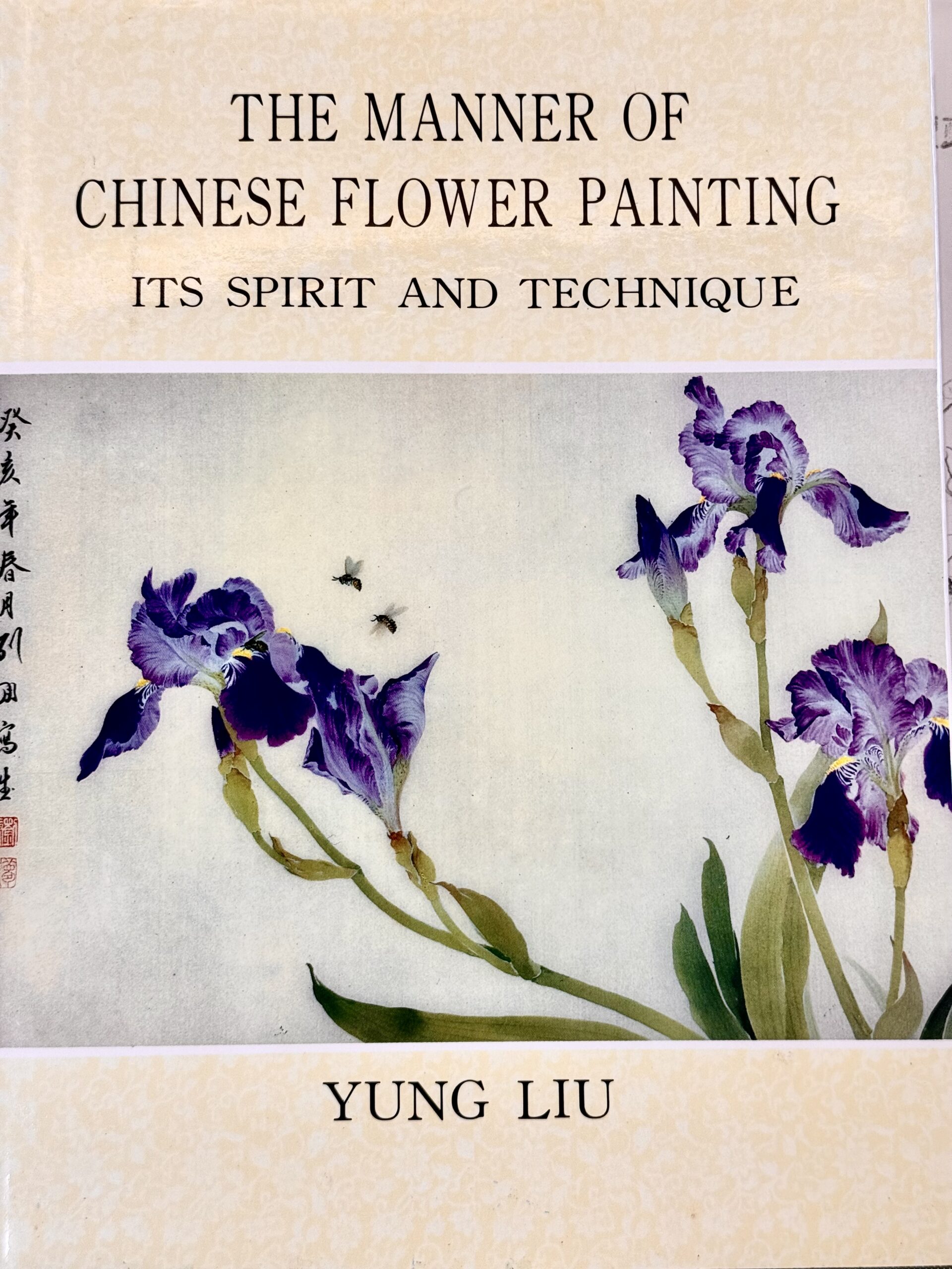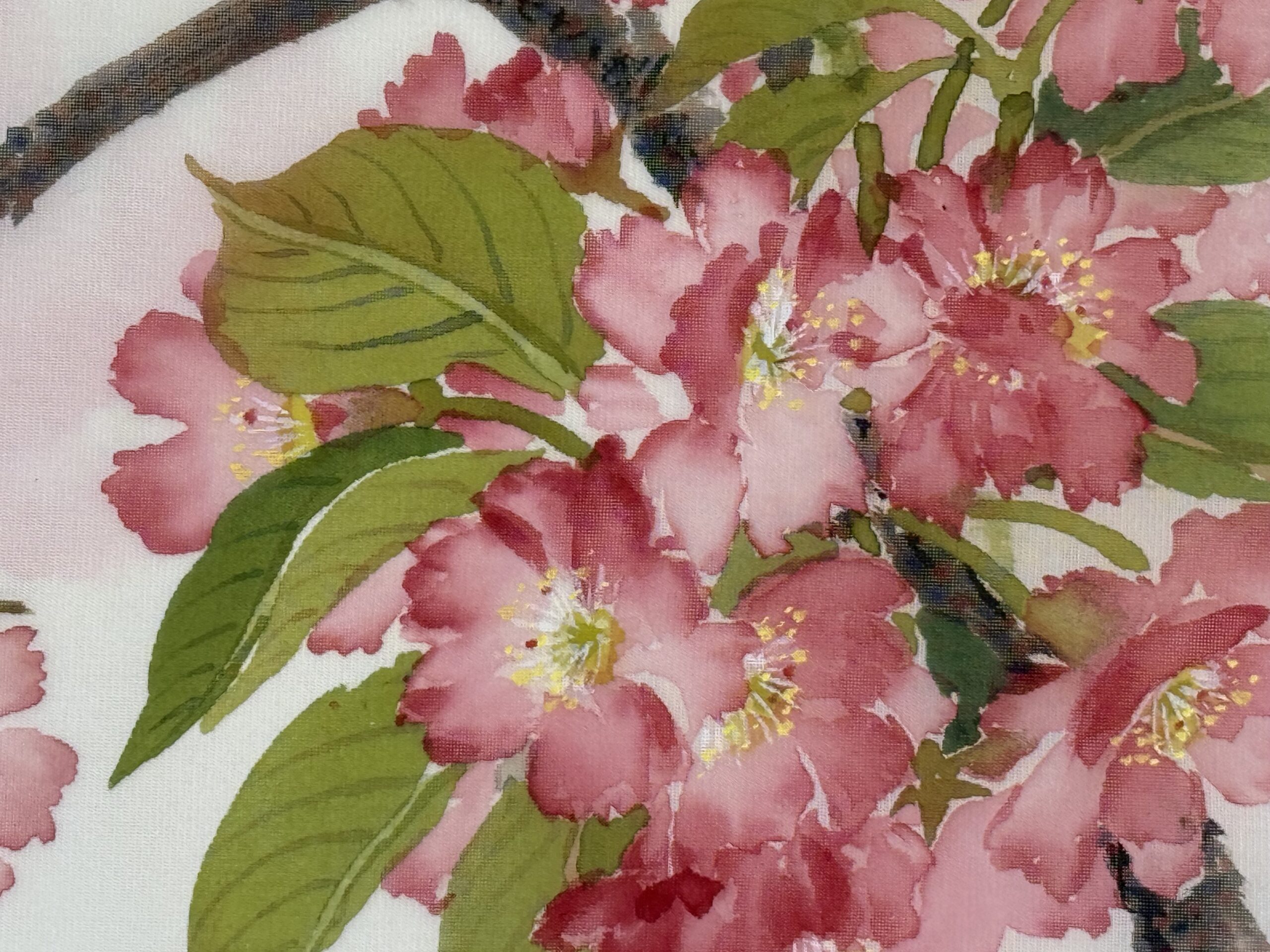 這幅畫是絹本,因為半透明,鳥的背面要用白色打底,相對的,嫩綠花葉可以表現絹的剔透。