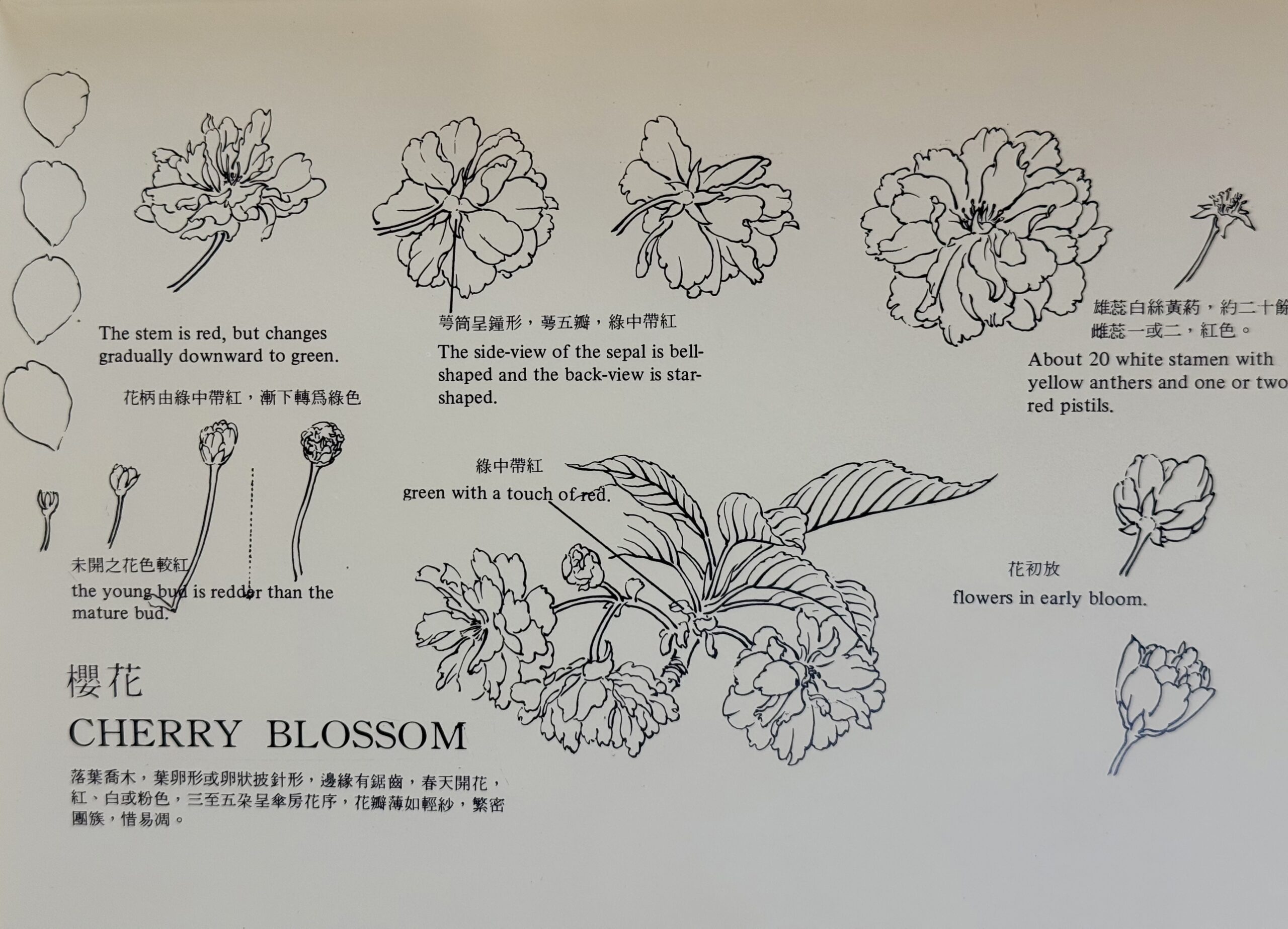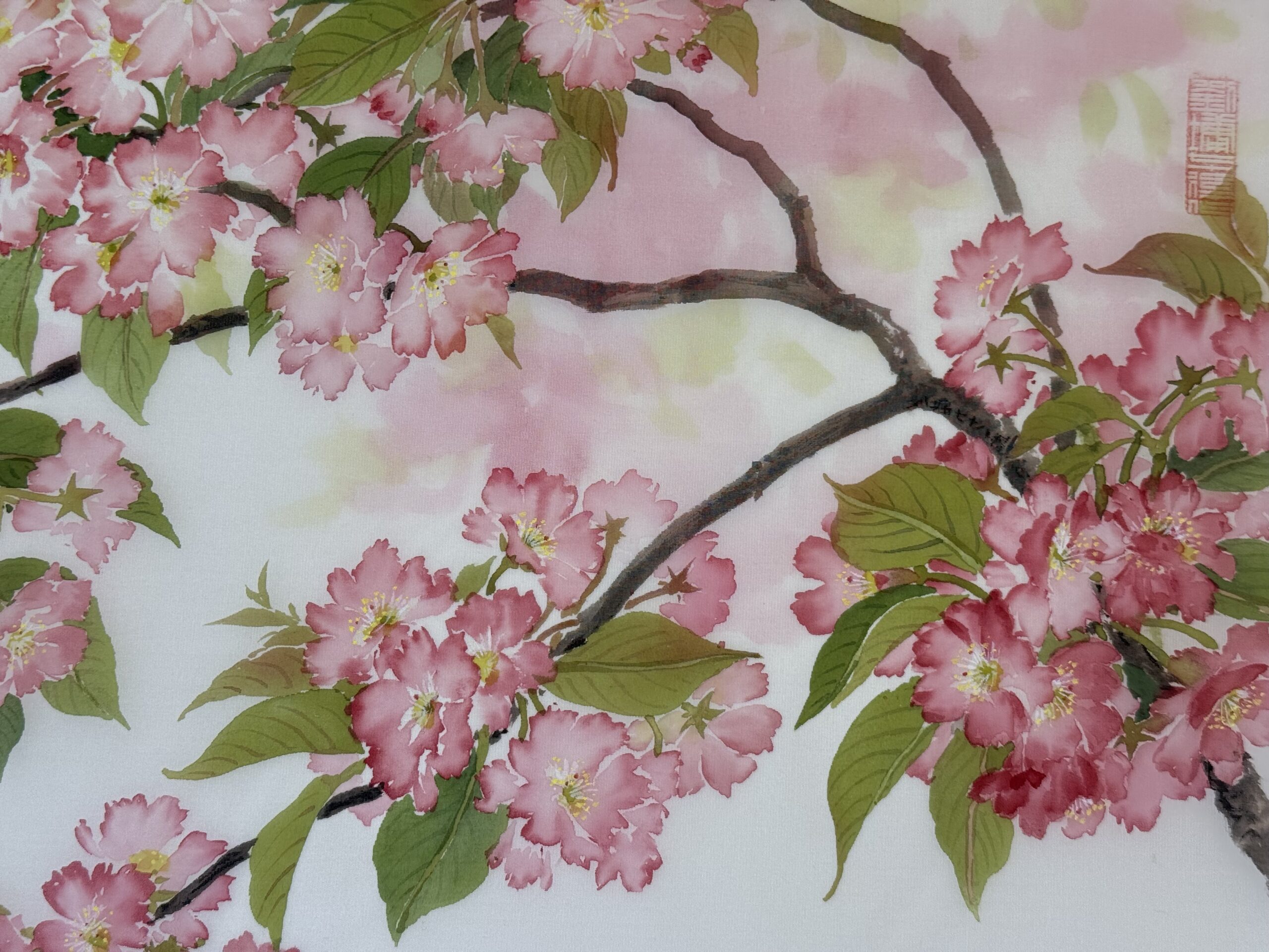 櫻花開的時候葉子都不大,尖尖的葉梢常帶點胭脂色,襯在紅花旁邊特別美!我常一邊畫一邊想,那像是千手觀音舞蹈少女的纖纖柔荑,輕柔、婉轉、挑動……